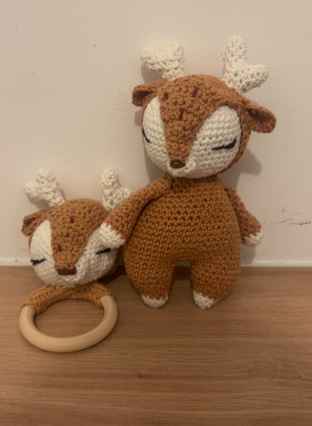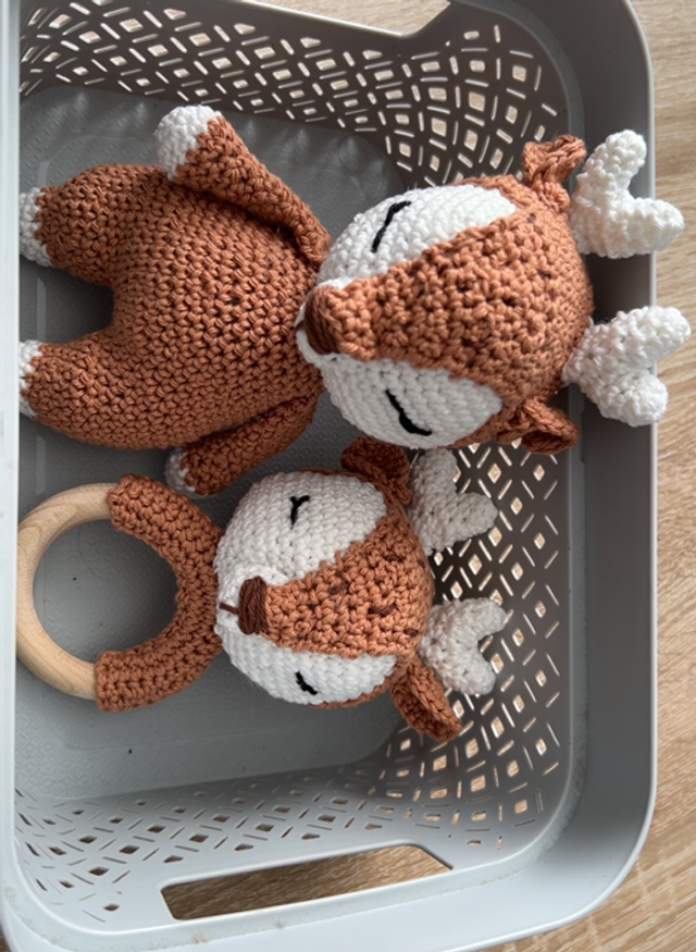 Craquez pour ce joli coffret cerf, composé d’une peluche assortie et d’un hochet, entièrement réalisés à la main au crochet 💕